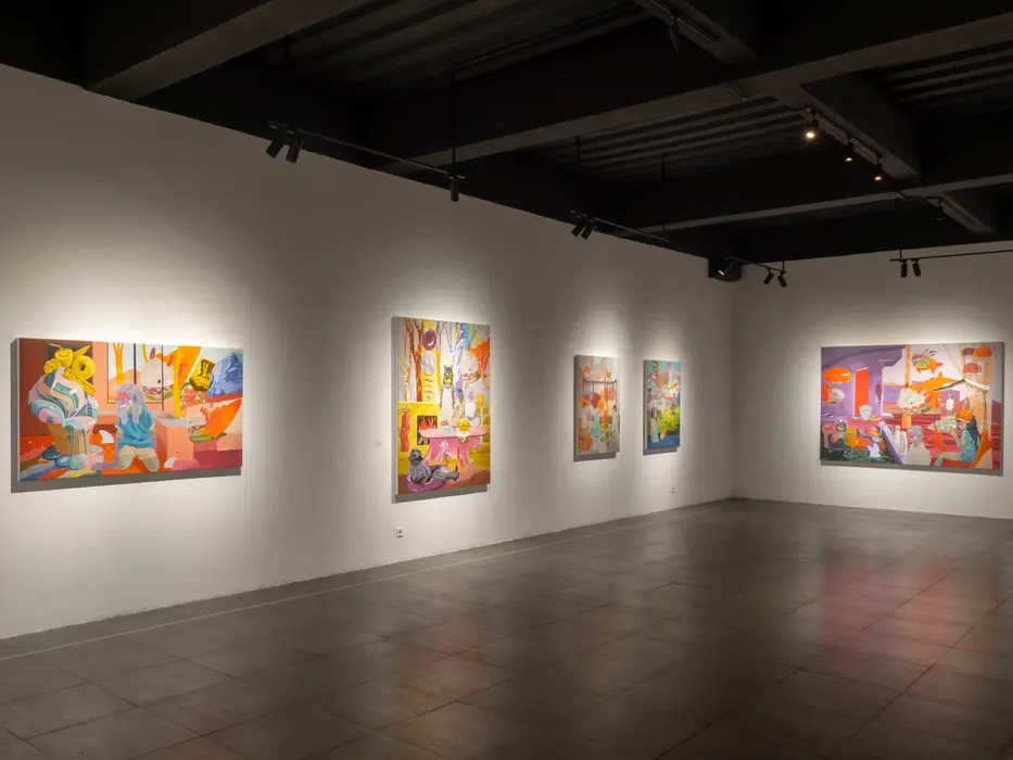 The work Step Into the Rising Glow portrays Antasena in modern attire, interacting with symbolic elements such as umbrellas, chairs, and luxurious food, representing human desires. Anjastama’s intricate landscapes, both indoor and outdoor, create a fusion of time and space, inviting the audience to delve into the journey of the characters.